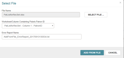 You can add patron records or item records to a record set from a file in one of the following formats: .txt, .csv, or .xls/.xlsx. To add patron records to a record set from a file, the file must contain a column with patron IDs that match to patron records already in the Polaris database. To add item records to a record set from a file, the file must contain a column with item barcodes that match to item records already in the Polaris database. If the file is an Excel file, you can specify which column contains the patron ID or the item barcode.