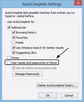 To prevent this from happening, disable the Autocomplete feature for Usernames and Passwords. This setting is under Tools| Internet Options | Content tab | AutoComplete options | Settings. On the AutoComplete Settings dialog box, clear the User names and passwords on forms check box to disable this option.