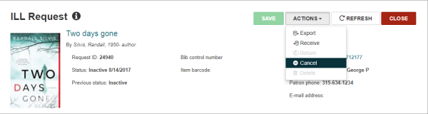 You can cancel an ILL request from the ILL Request workform or the ILL view of the Patron Record workform. To cancel an ILL request, it must have a status of Inactive or Active.