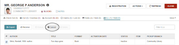 - Select the check box next to the ILL item you want to cancel, and click Cancel.