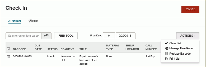 You can print check-in receipts when checking in items in normal or bulk mode. If multiple items for the same patron are selected, the receipt lists the selected items. If multiple items for multiple patrons are selected, the receipts are grouped by patron.