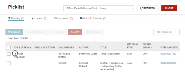 Staff members who handle items requested through INN-Reach can easily identify these items in the Picklist. Any items in the Picklist that were requested through INN-Reach are identified with an I icon.