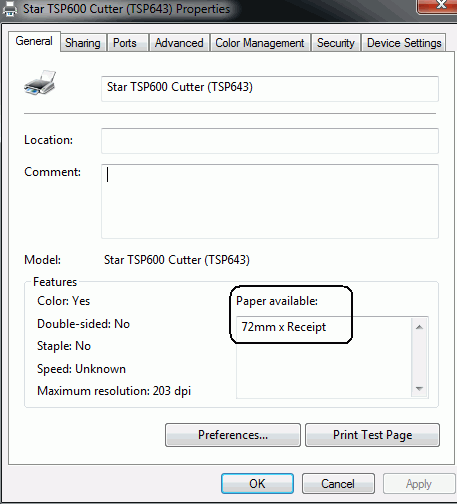 - Check the Printer Properties window to see that the correct paper size is listed under Paper available.