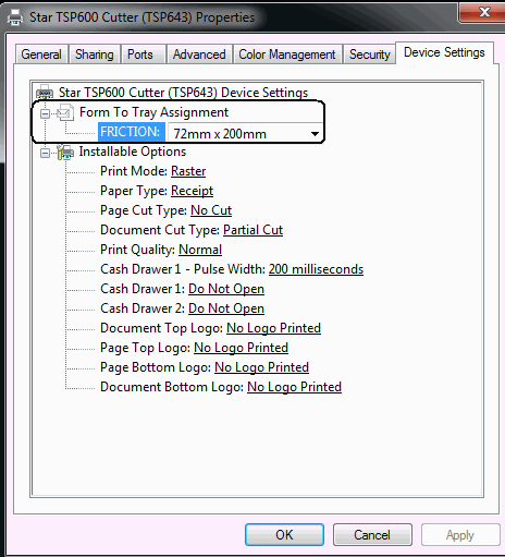 - Select Form To Tray Assignment, and selectFRICTION:72mm x Receipt.