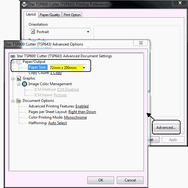 - Select Paper/Output, and choose Paper Size: 72mm x 200mm.