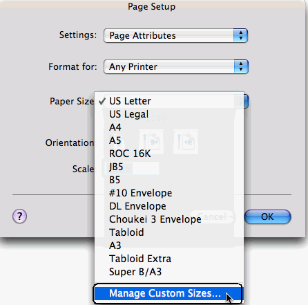 - Open the drop-down list in the Paper Size box, and choose Manage Custom Sizes.