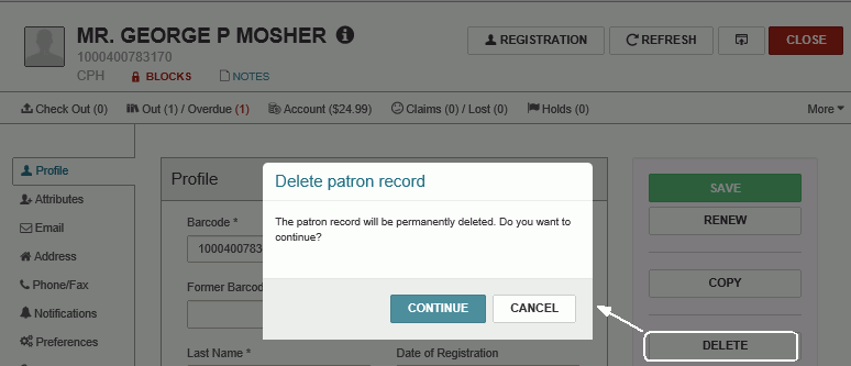 - Select CONTINUE to delete the patron record.