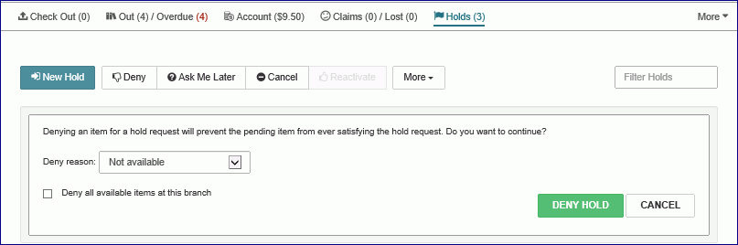 - (Optional) If you want to deny holds for all items at this branch, choose Deny all available items at this branch.