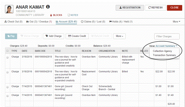 To view the patron's financial account with your library, open the patron record, and select Account. The patron's Account Summary list appears. To change the view, select Collection Agency or Transaction Summary.