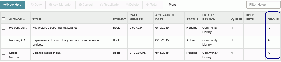 When you scan the item that fills the hold request for any of the titles in the group, the hold is placed on the selected title, and the other titles in the group are no longer listed.