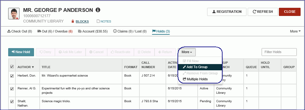 You can group several titles if any one of the titles will satisfy a hold request. When one of grouped requests is filled, the other requests in the group are deleted. The group is counted as a single request against the patron’s total request limit.