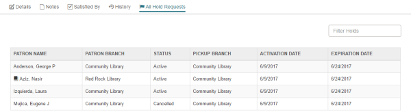 The All Hold Requests view displays all hold requests for the bibliographic record, including requests with an Inactive, Cancelled, Expired, Unclaimed, or Out to Patron status.