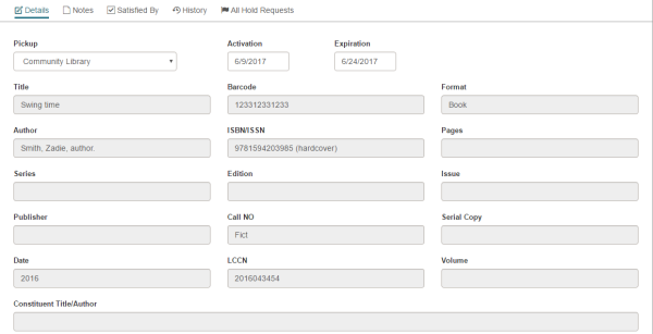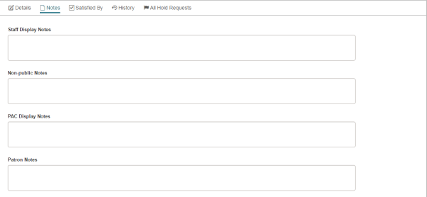 The Notes view displays any notes that may have been entered for a hold request. You can enter notes in the Staff Display Notes, Non-public Notes, and PAC Display Notes fields.