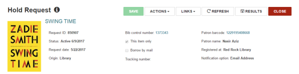 The Hold Request workform header includes general information about the hold request, including a Bib control number link to the bibliographic record and a Patron barcode link to the patron record. The header information does not change when you select another workform view.