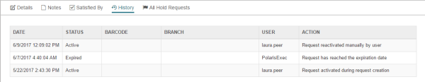 The History view displays the history for this hold request.