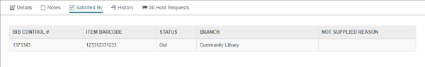The Satisfied By view lists all the items that can fill the hold request. You can select an item in the list to open the Item Record workform.