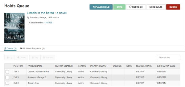 From the Holds Queue, you can view hold requests for a specific title or item; change the order in which requests are filled; and place new hold requests.