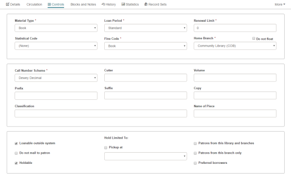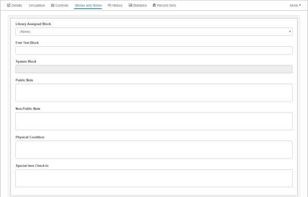 The bottom part of the page changes depending on the selected view: Details, Circulation, Controls, Blocks and Notes, History, Statistics, Record Set, Notices, or Source and Donor. If there are blocks or notes associated with the item record, the Blocks and Notes icon appears in red.