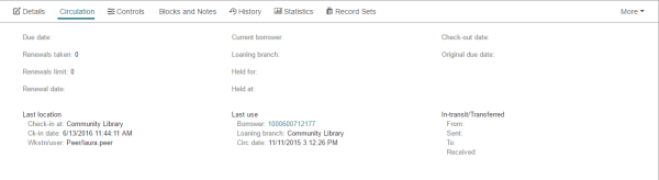 The Circulation view of the Item Record displays circulation information for the item.