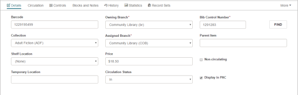- ILL, eContent, Non-circulating, and Display in PAC check boxes - A check indicates the option is active. For example, a check box in Display in PAC means the item appears in the Polaris PowerPAC and Mobile PAC.