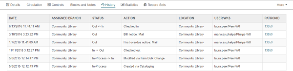The History view displays the transaction history for the items. You can click the patron ID to go to the patron record associated with the transaction.