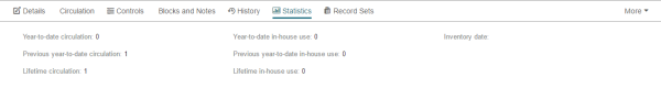 The Statistics view displays circulation and inventory statistics for the item.