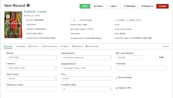The settings that apply to item records in the Polaris staff client (such as the loan period, item home branch, and hold limited to) are also applied to item records displayed in Leap.