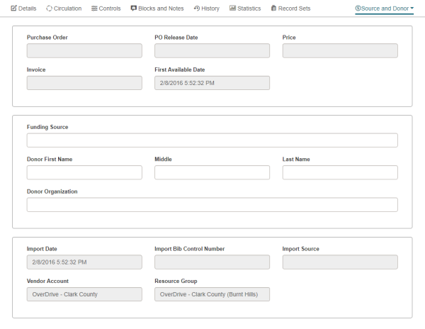To view source and donor information, including import information for eContent items, select More | Source and Donor.