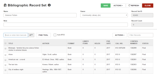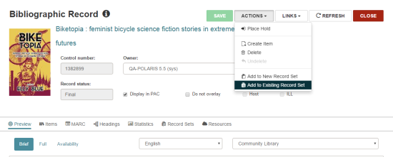 The record set opens in the Bibliographic Record Set, Item Record Set, or Authority Record Set workform. The record you selected is added to the record set, and it appears at the top of the list.