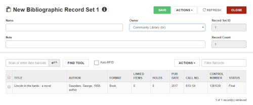 The Item Record Set, Bibliographic Record Set, Authority Record Set, or Patron Record Set workform opens. The new record set contains the record you added.