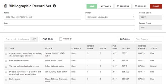 You can immediately export bibliographic, item, authority, or patron records listed in the Find Tool search results to a new record set.