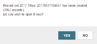 The message Record set created successfully appears, and a dialog box displays the name of the new record set and the number of records in it.