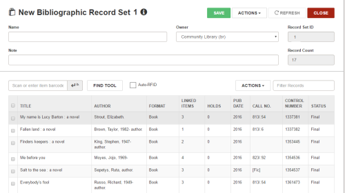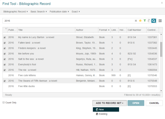 You can create a new record set by selecting records in the Find Tool results list and then adding them to the new record set. When you select the records in the Find Tool results list, the records are added to a record set of the same type. For example, if you select bibliographic records and select ADD TO RECORD SET | New, the records are added to a new bibliographic record set.
