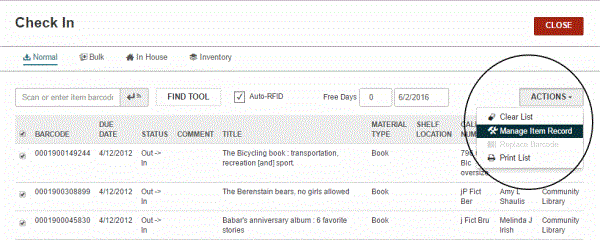 - Select ACTIONS and choose Manage Item Record in the drop-down list box.