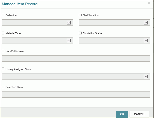 If you have the required permissions, you can select one or multiple items and use the Manage Item Record option to change the collection, shelf location, material type, circulation status, non-public note, library assigned block, or free text block. The Replace Barcode option is available only when a single item is selected. For more information on these Circulation permissions, see Polaris staff client Help.