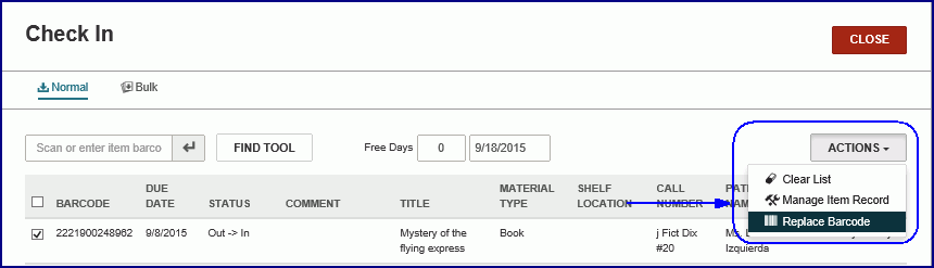 - Select ACTIONS and choose Replace Barcode in the drop-down list box.