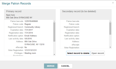 The Merge Patron Records dialog box displays the primary patron's details on the left side and the secondary patron's details on the right side. The details displayed depend on the settings in the Patron Services Administration parameter Check Out: Optional Patron Data. If you want to review the secondary record before merging, click Open record.