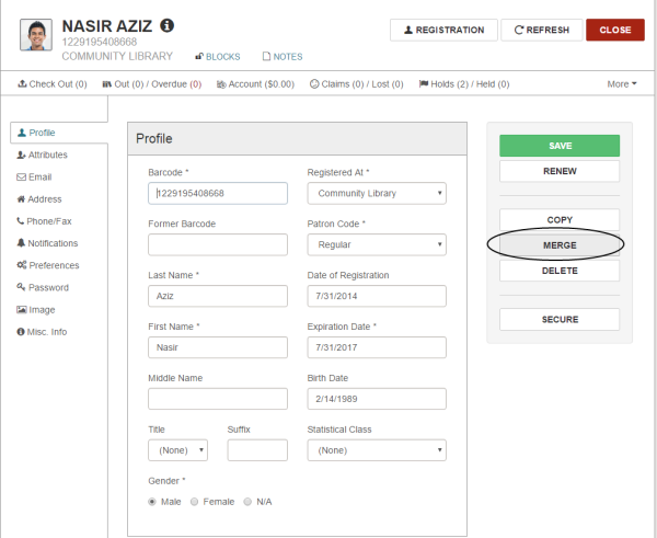 - Notes – The notes from the deleted record are appended to the notes on the saved record and separated by a blank line. A note indicates the record was merged and provides the barcode of the deleted record and the date/time that the merge occurred.