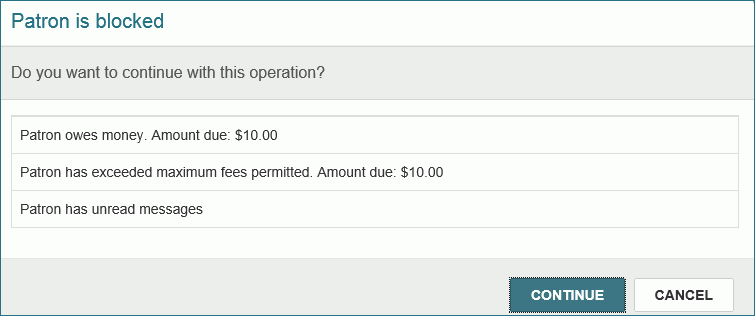 As you check out items in Leap, messages or blocks may appear due to the status of the item or the patron. For example, the item may be in-transit, or the patron may owe fines.
