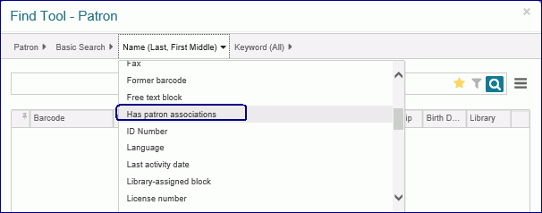 To find patron records that have associations, you can limit patron searches in the Find Tool using the qualifier Has patron associations.