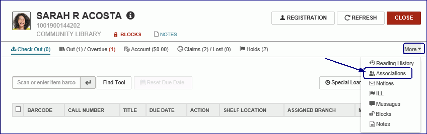 To see the associated patrons, select More | Associations.