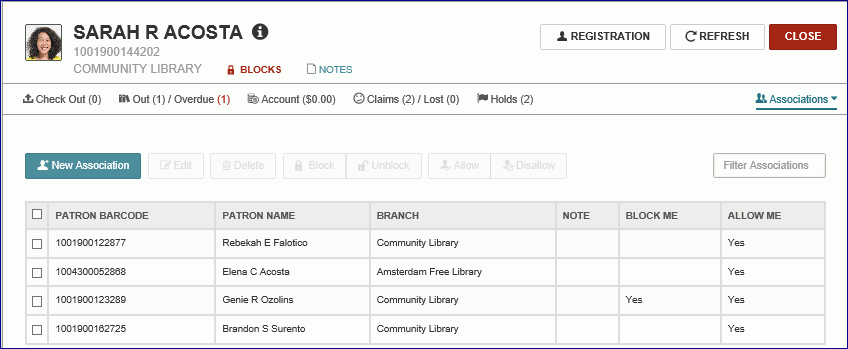 You can create associations between two or more patron records so that when one record is open, all associated patron records are conveniently accessible. For example, you might associate all members of a family, so when checking out items to parents, you can quickly renew items or pay fines for their children. Depending on your library's default settings in Polaris Administration, patrons may be blocked when their associated patrons are blocked, and/or they may be allowed to check out items for their associated patrons.