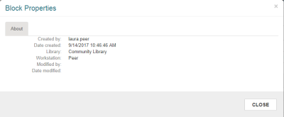 The Block Properties window displays the user name of the staff member who created the block; the date the block was created; the sign-in branch for the staff member who created the block; the workstation where the block was created; and the staff member who modified the block and the date modified (if the block was modified).