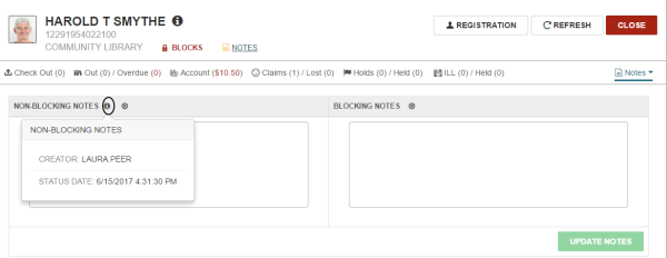 The patron Notes view displays existing non blocking notes and blocking notes. You can add notes, edit existing notes, and delete notes from this view. To see patron notes, select More | Notes. If the NOTES button is yellow, the patron record contains notes. You can click on the information icon to see the note creator and the date and time the note was added or updated.