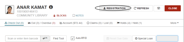 To access registration information for an existing patron, open the patron record and select REGISTRATION.