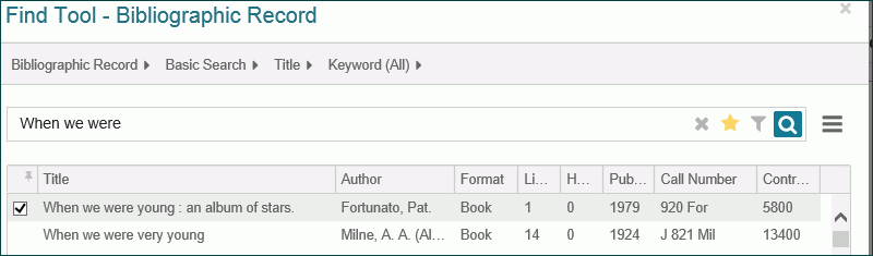 - Click/ tap inside the Title box and start typing the title. Then, press Enter or select the return button to see the results in the Find Tool. Or, select the Find Tool button to open the Find Tool and search for the bibliographic record.