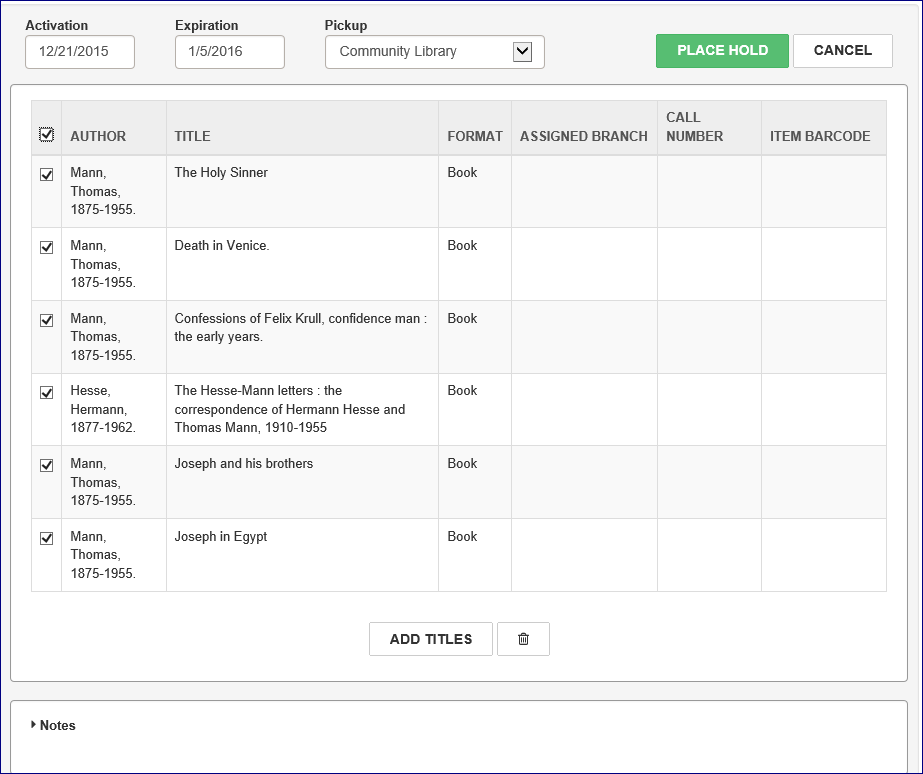 The titles are displayed in a list, but the holds are not placed until you select PLACE HOLD.