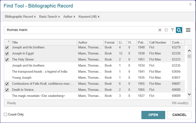 You may be able to search for and select multiple titles at once and select them in the Find Tool results. For example, if the patron wants to place holds on multiple titles with the same author, you can search by author and select the titles in the Find Tool results list.