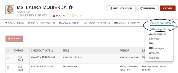 To view a patron's reading history, open the patron's record and select More | Reading History.