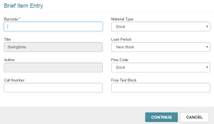 - (Optional) Change the default selections in the Material Type, Loan Period, or Fine Code boxes.